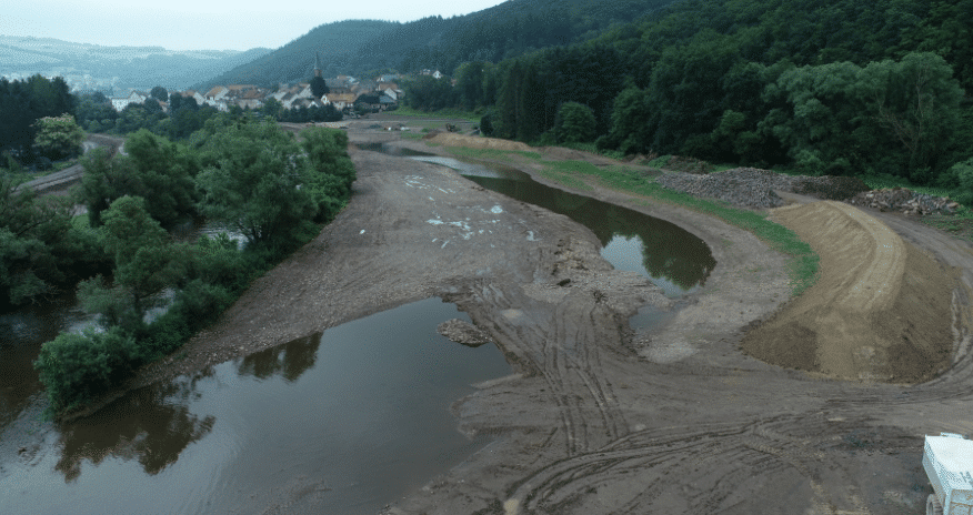 Für die Struktur- und Genehmigungsdirektion Nord des Landes Rheinland-Pfalz hat die Dr. Pecher AG an der Nahe bei Hochstetten-Dhaun die Ertüchtigung des vorhandenen Hochwasserschutzes geplant. Aktuell werden die Maßnahmen baulich umgesetzt. Dabei besteht die Aufgabe nicht darin einfach nur die vorhandenen Deiche zu erhöhen, sondern es ist ein erklärtes Ziel der Nahe gleichzeitig mehr Raum zur Ausbreitung bei Hochwasserabflüssen zu geben. Dieser zusätzliche Retentionsraum hilft dabei die Hochwasserwelle in der Nahe zu bremsen und somit auch die Unterlieger von Hochwassergefahren zu entlasten. Zu diesem Zweck werden vorhandene Deiche zurückgebaut und seitlich der Nahe ein rd. 350 m langer neuer Seitenarm angelegt, der sich zukünftig naturnah entwickeln soll. Insgesamt werden bei der Maßnahme rd. 130.000 m³ Erdmassen bewegt. Würde man diese Erdmassen auf LKW-Sattelzüge verladen, ergäbe das eine Fahrzeugschlage von über 100 km, wenn man die Fahrzeuge „Stoßstange an Stoßstange“ aufstellen würde.